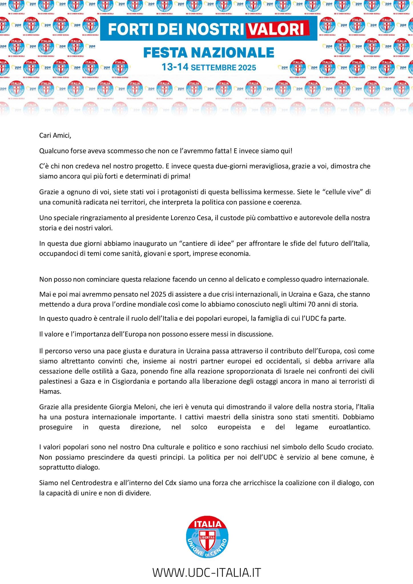 si è conclusa domenica a Roma la Festa Nazionale dell’UDC 2025, due giornate intense di confronto e partecipazione che hanno segnato l’avvio di una nuova fase per il nostro partito e per l’intero centrodestra.