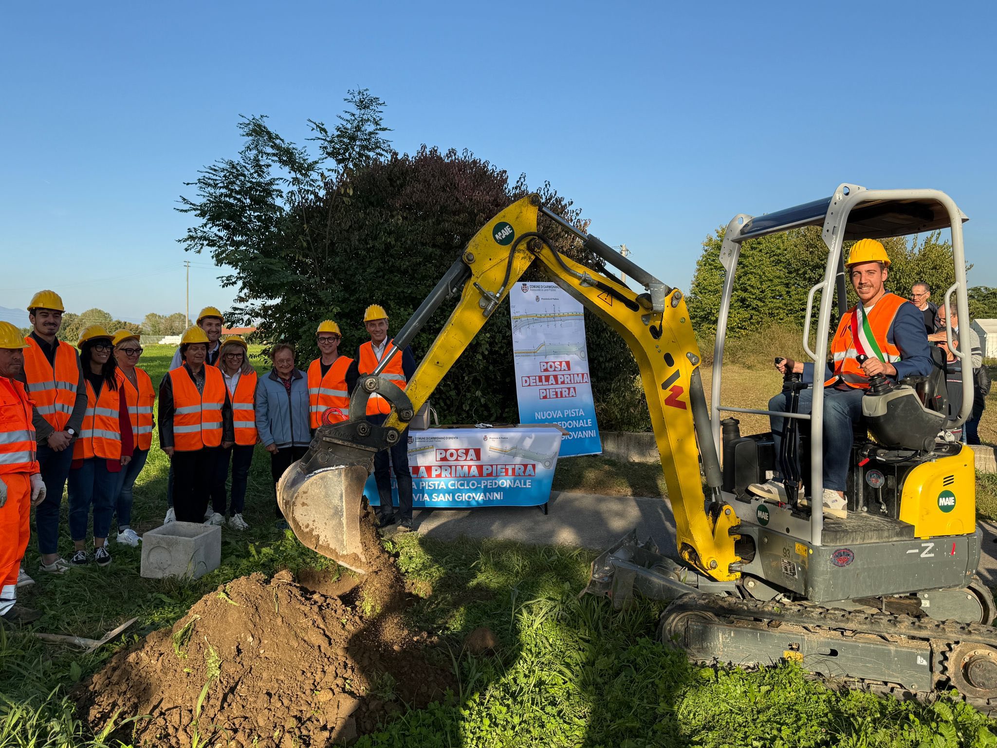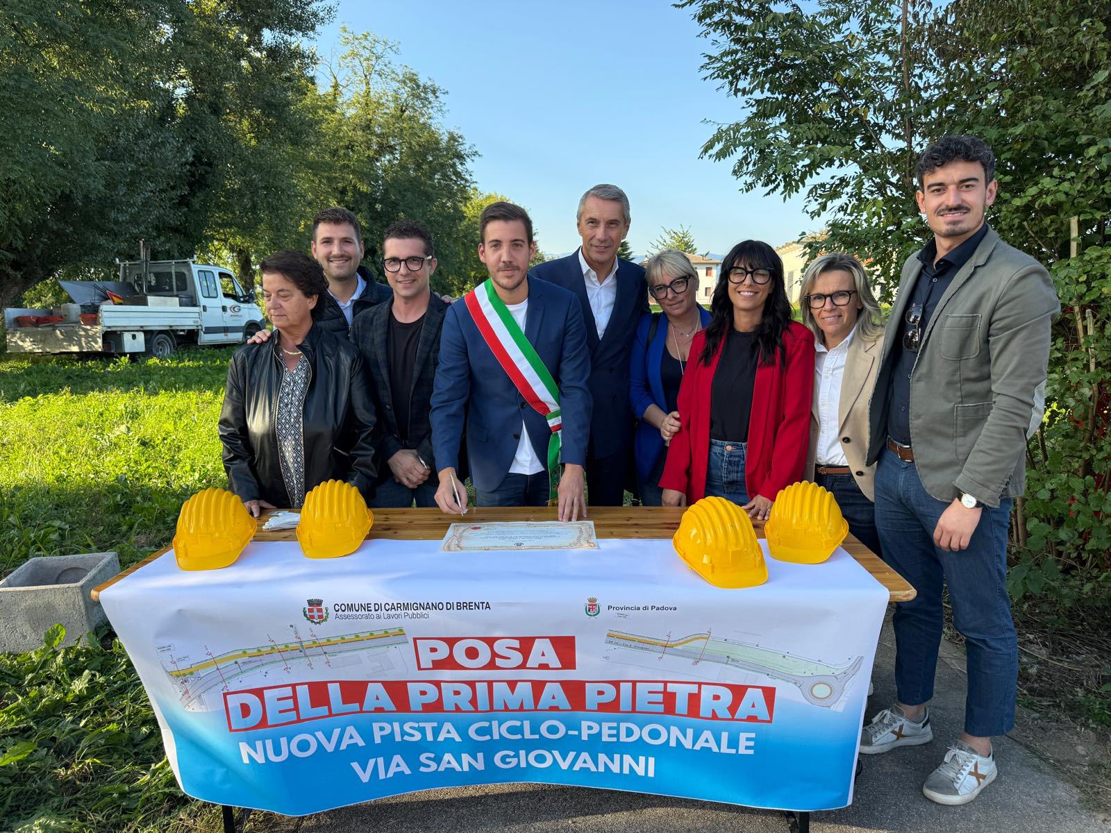 oggi a Carmignano di Brenta é stata posata la prima pietra della nuova pista ciclopedonale lungo la S.P. 16 – San Giovanni, un intervento che inizierà già dalla prossima settimana e che consentirà di proseguire la ciclabile già esistente, collegando il centro con il punto più a nord del paese.