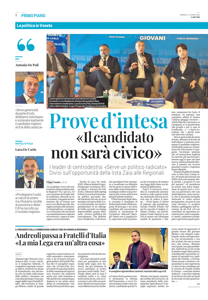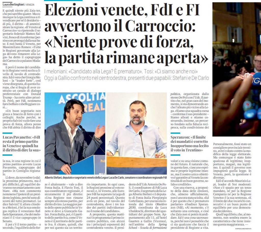 Siamo al servizio del Veneto e dei veneti soprattutto, e questo deve guidarci in ogni scelta. Le posizioni emerse in questi giorni fanno parte delle dinamiche politiche, di una sana dialettica, vanno raccolte e trasformate in una sintesi politica all’altezza della sfida.