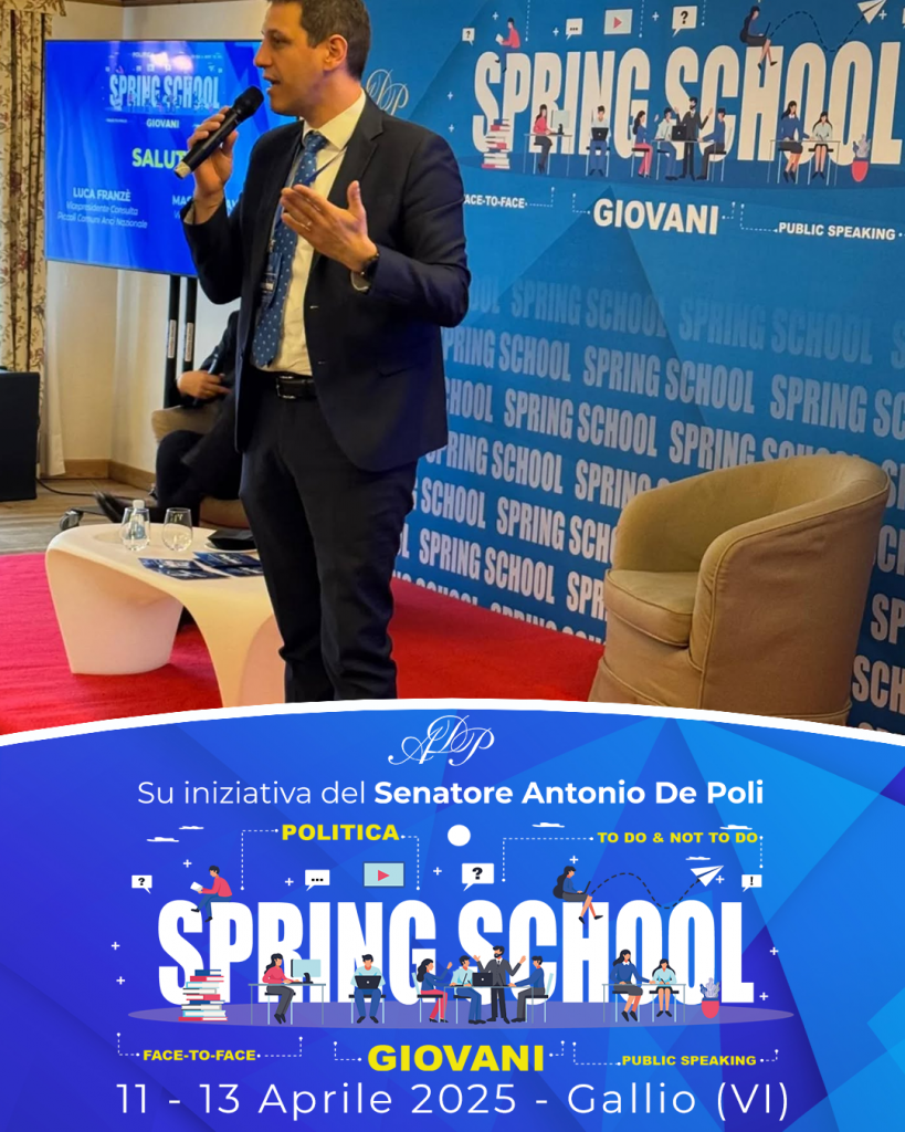 Videomessaggio di saluto dell’on. Lorenzo Cesa, Presidente della delegazione italiana all’assemblea parlamentare della NATO e a seguire i saluti di Luca Franzè, Vicepresidente Consulta Piccoli Comuni ANCI Nazionale e Massimo Cavazzana Vicepresidente ANCI Nazionale. Tavolo “Come si costruisce una campagna elettorale” con Marco Marturano, giornalista e spin doctor e conclusione con gli organizzatori della Spring School 2025